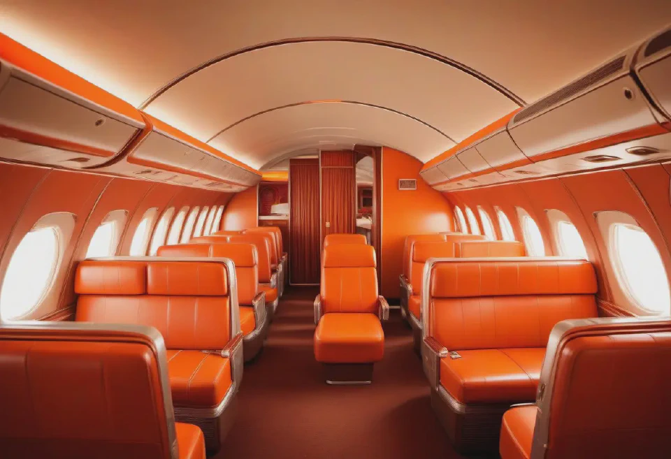 A retro-themed airliner interior, inspired by the 1960s golden age of air travel, featuring vibrant orange and red seats, classic overhead luggage bins, and a cocktail lounge, viewed through a sepia filter to enhance the vintage feel.
