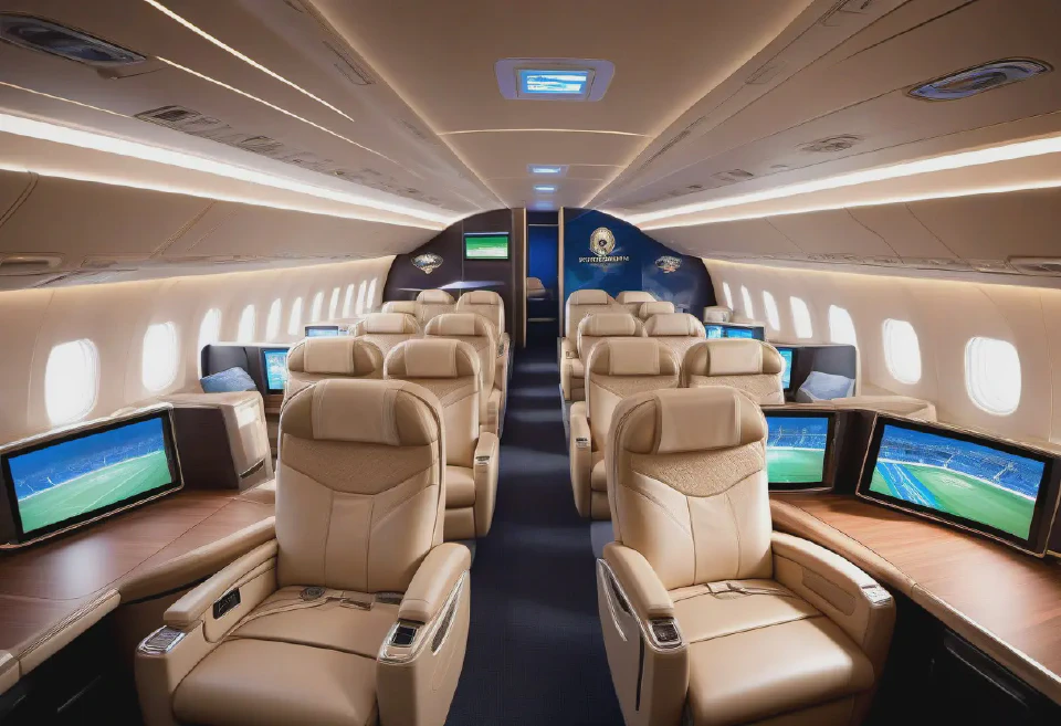 A detailed interior of a VIP airliner cabin customized for a sports team, including full-recline leather seats, areas for strategy meetings, high-definition screens for game analysis, and personalized lockers, showcasing the blend of luxury and functionality from a panoramic perspective to include all amenities.