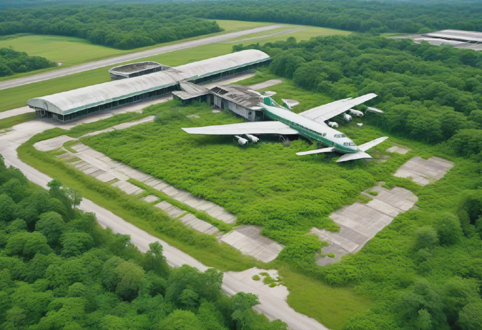 Historic aerial view of an abandoned airport reclaimed by nature, with overgrown runways and a deteriorated terminal building, set in a green, lush environment. Visible effects of aging and nature reclaiming the infrastructure, with high detail in the textures of vegetation and decaying structures. Elaborate atmosphere:1.4.