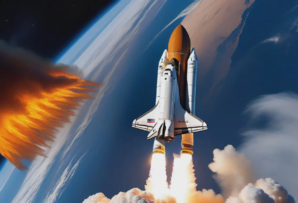 5. A next-generation space shuttle, designed for efficiency and reusability, launching from Earth with a vibrant flame trail, HQ, 4K, showcasing a blend of cutting-edge and traditional design elements.