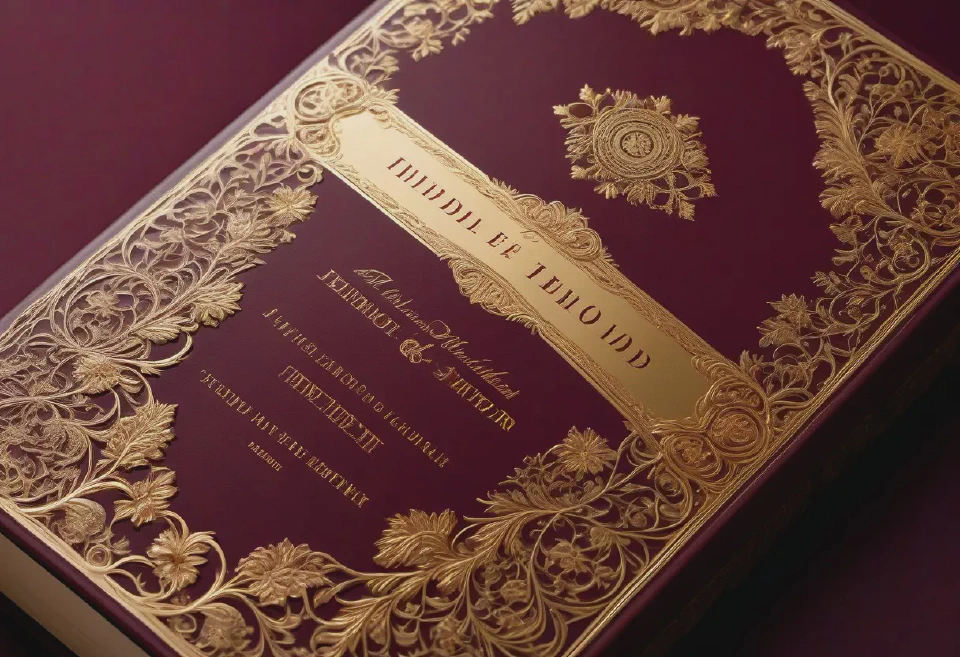 A vintage-style book cover featuring an intricate gold foil design on a deep burgundy background, the title and author’s name elegantly embossed in a classic serif font, viewed from a slightly angled perspective to highlight the texture.