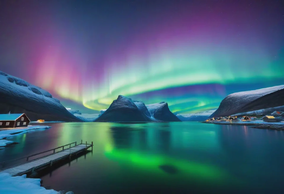 5. An image of the Northern Lights (Aurora Borealis) dancing over a scenic fjord in Norway, with a traditional Nordic cabin by the water's edge. The camera angle should be wide to capture the vastness of the sky and the vivid colors of the lights.