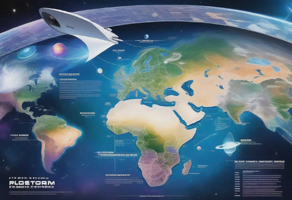 A futuristic map for a space-themed vacation itinerary visiting international space centers, observatories, and museums, with a sci-fi design including holographic elements, star charts, and alien illustrations.