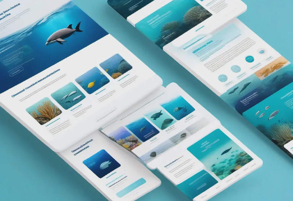 A marine conservation organization's website interface, emphasizing a clean, oceanic aesthetic with custom AI-generated illustrations of endangered marine species. Key sections include "How to Help," "About Marine Life," and "Upcoming Events," each with background illustrations of underwater ecosystems.