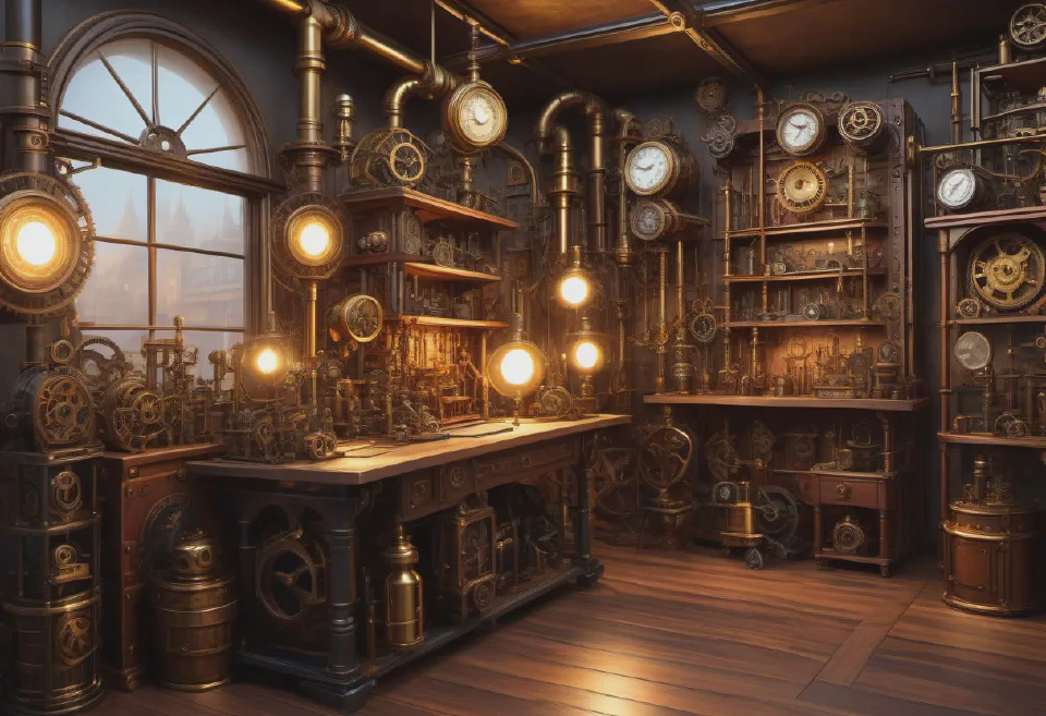 A steampunk workshop, filled with brass gadgets, intricate machinery, and soft, ambient lighting, in a highly detailed, realistic style.