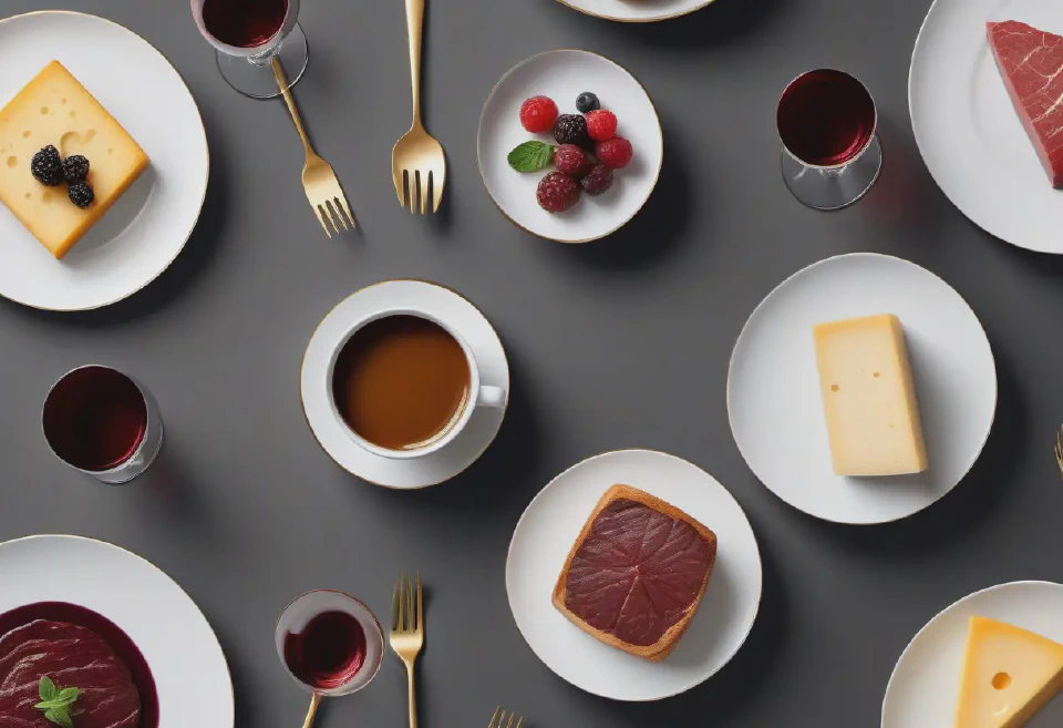 4. A series of 8K, elegantly designed food and beverage icons for a gourmet restaurant's website, showcasing a chef's hat, fork and knife, wine glass, cheese wheel, fish, steak, dessert, and a coffee cup, with a sophisticated palette of gold, black, and burgundy.