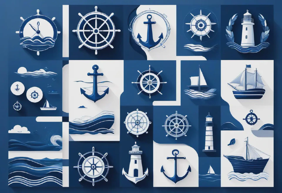 7. A suite of 8K, nautical-themed icons for a maritime adventure blog, including a ship wheel, anchor, lighthouse, waves, seagull, fish, telescope, and treasure chest, rendered in deep blues and whites to match the oceanic vibe.