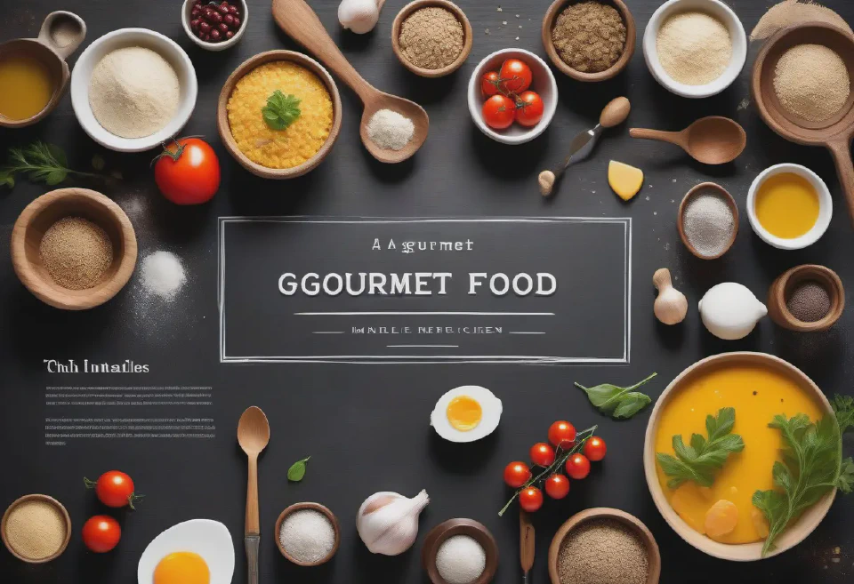 10. A gourmet food-themed footer design featuring a high-definition photo background of a rustic kitchen table filled with ingredients. Custom icons resemble cooking utensils, and the contact info is presented on a mock-up chalkboard. 8K resolution, macro lens for texture detail.