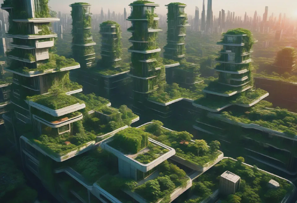 A dystopian cityscape with futuristic buildings overgrown with vegetation, sunset lighting, aerial perspective.