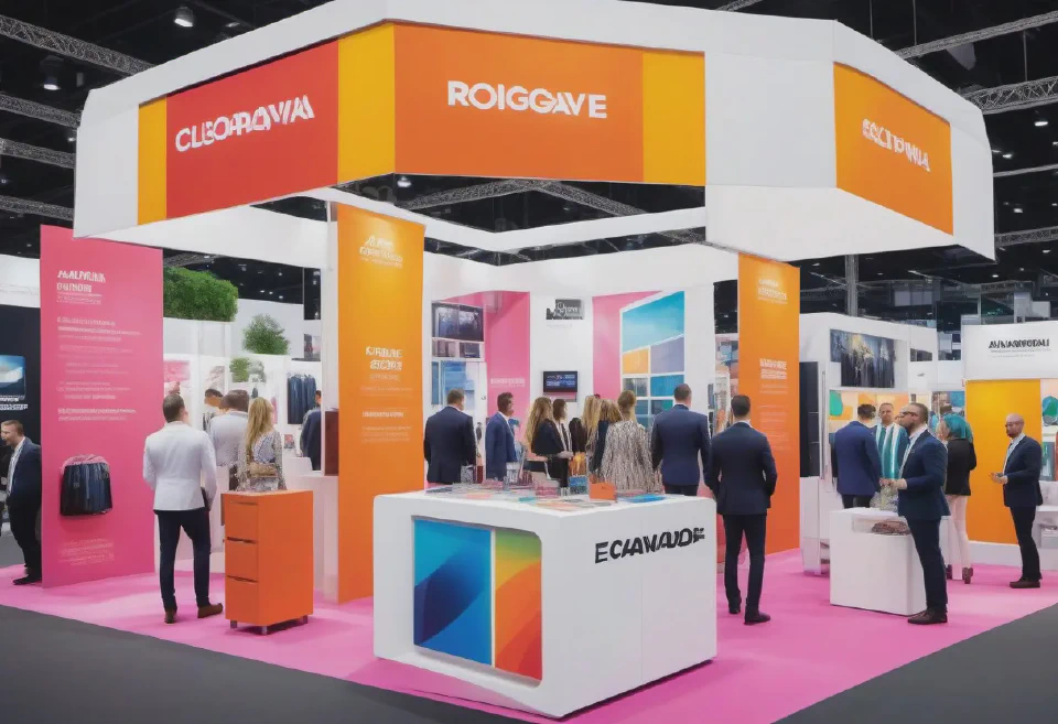 4. A dynamic 4K snapshot of a bustling trade show booth filled with vibrantly colored custom merchandise, including printed canvases, bespoke clothing items, and tailored gadget accessories, capturing the essence of market trends for procurement specialists. Lens: 18mm.