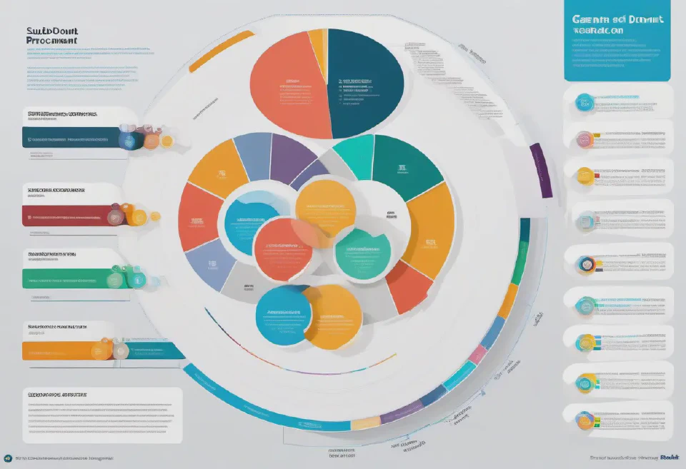 10. A comprehensive, multi-layered donut chart, rendered in high quality, showing the granular budget allocation within a government department's procurement, including sub-categories like IT services, office supplies, professional services, and maintenance contracts. Each layer of the donut represents a category, with distinct colors and labels for sub-categories.